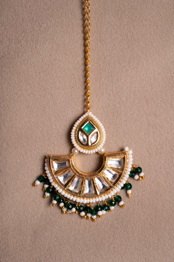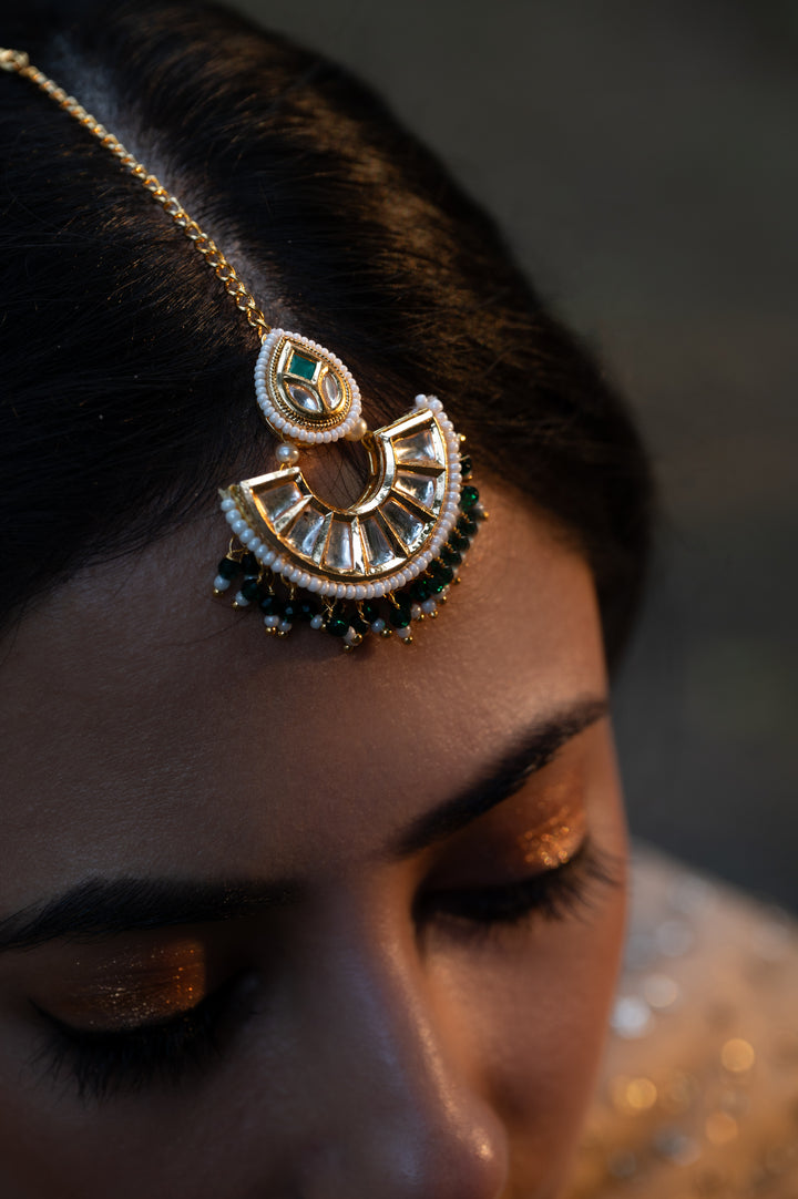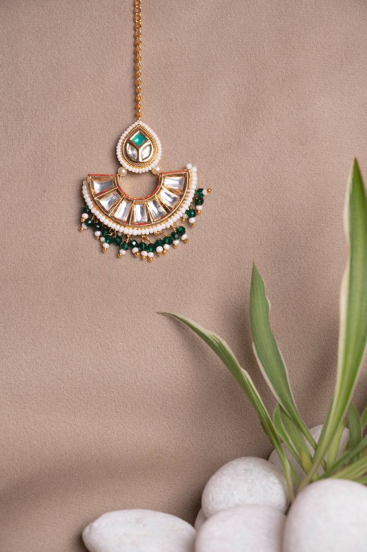 Featuring Maang Tikka with Green Drops, a stunning piece of jewelry that will add a touch of elegance to any outfit. The maang tikka features a beautiful surreal design that symbolizes light and positivity, while the green drops add a pop of color and sparkle. Handcrafted by skilled artisans, this maang tikka is made with high-quality materials for durability and longevity. Perfect for weddings, parties, or any special occasion.