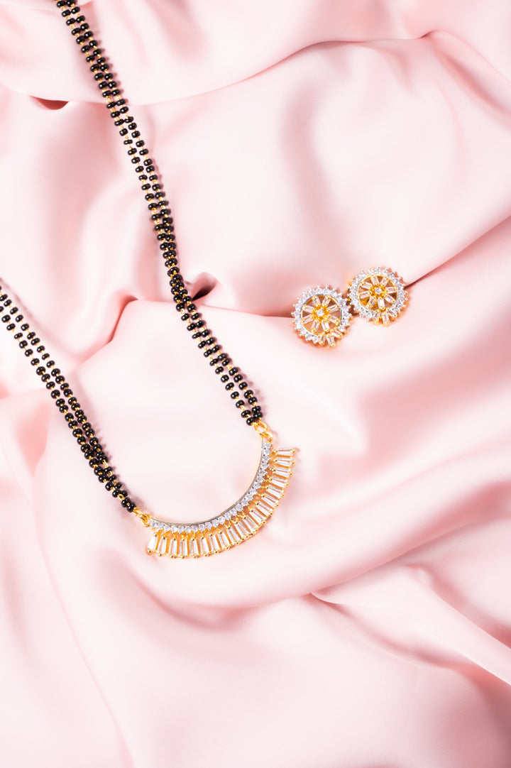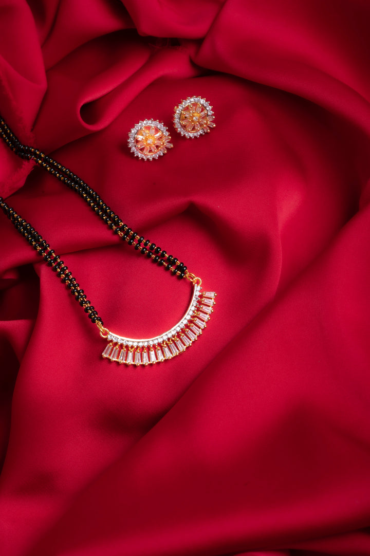 This ravishing mangalsutra set features a beautiful design with earrings adorned with American diamonds. Crafted with high quality materials, it adds a touch of grace and sophistication to any outfit. Perfect for any special occasion, it is a timeless piece that will complement your personal style.