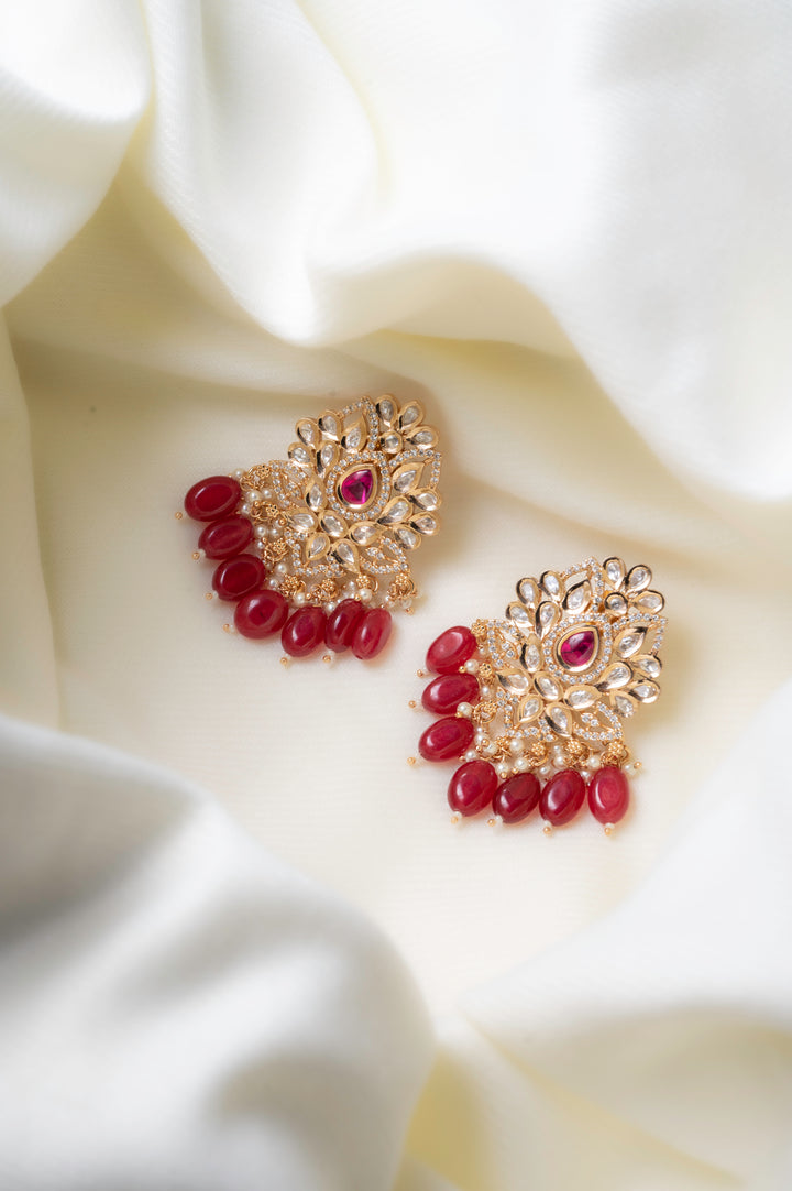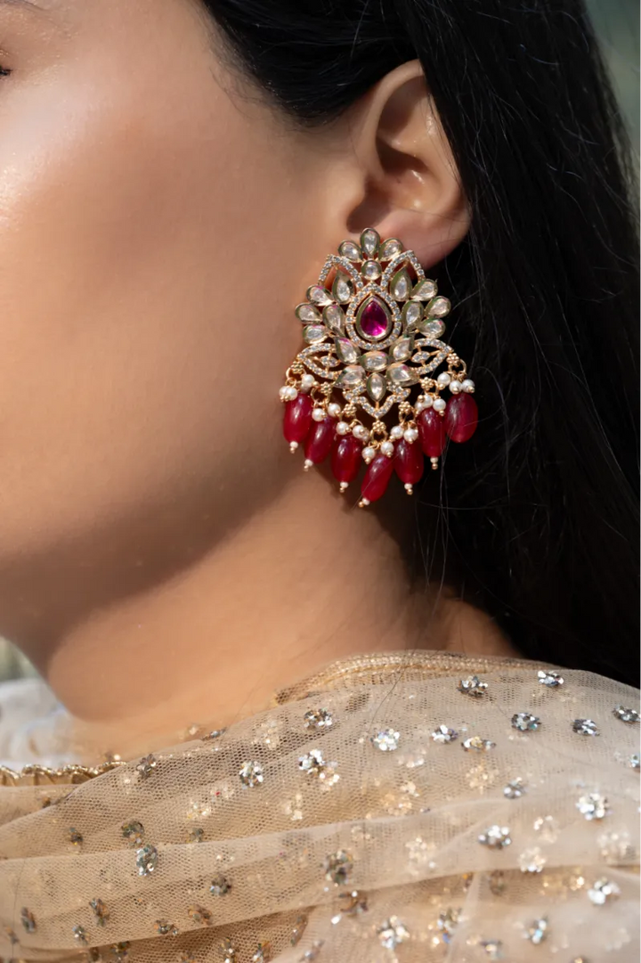 These meticulously handcrafted polki earrings are made to light up any room you walk in. They exude royal charm and traditional elegance. The maroon drops showcase captivating display of light and  a touch of luxury. Pair these with your tradition ensembles or your indo- western outfits and dazzle the nights.