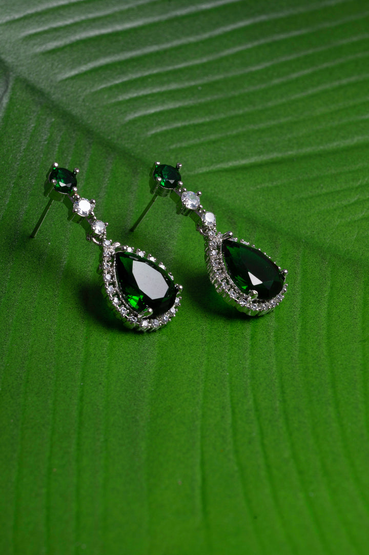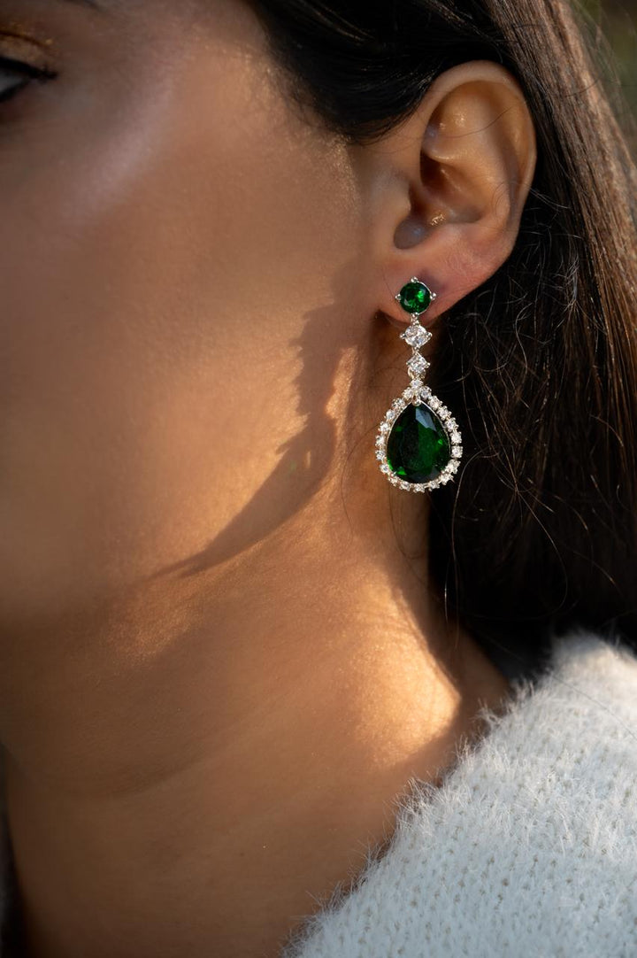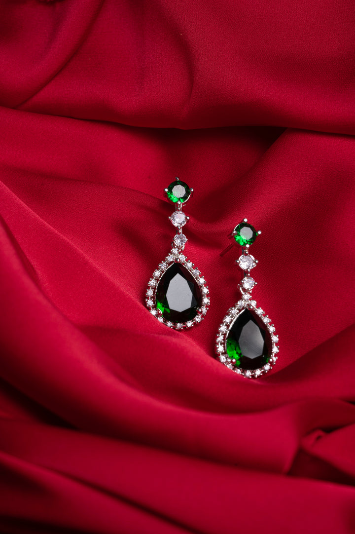 "Add a touch of glamour with these stunning emerald earrings, accented with sparkling American diamonds. Perfect for any occasion!