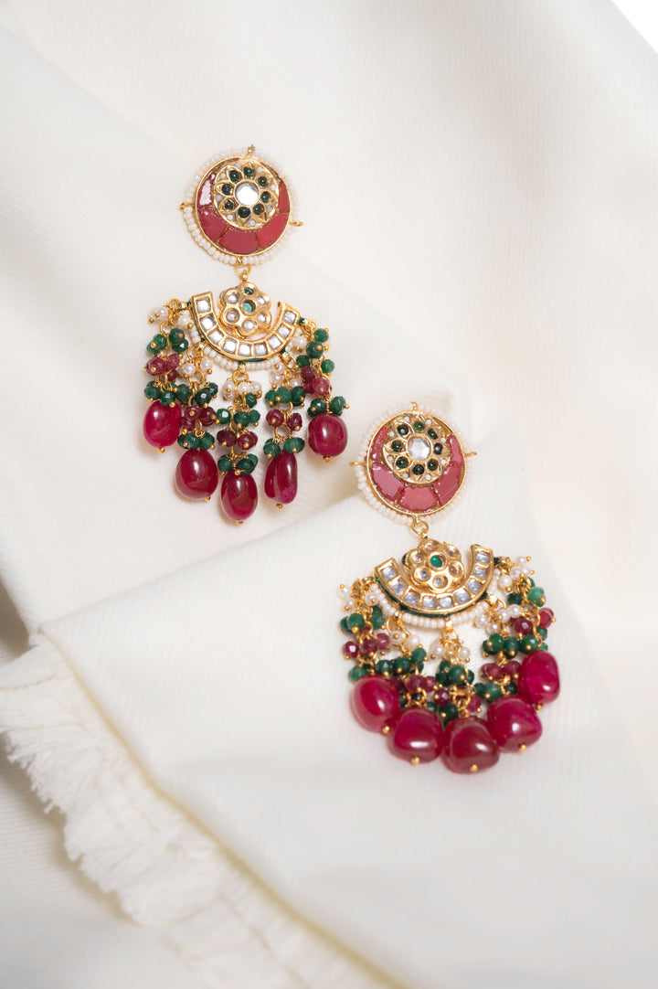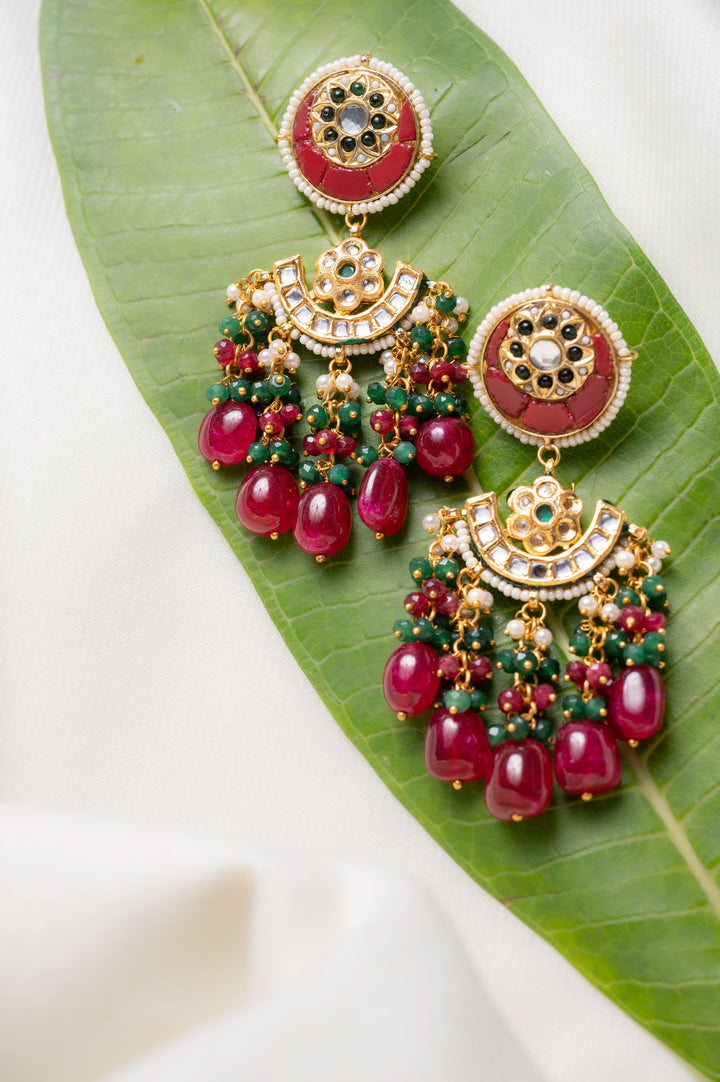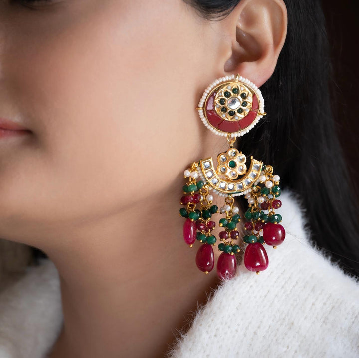 Discover the perfect fusion of modern and traditional with our Vibhava earrings. Adorned with vibrant coloured stones and authentic meerut kundans, these earrings are sure to add a touch of elegance to any outfit. Handcrafted with precision, these earrings are the perfect statement piece for any occasion.