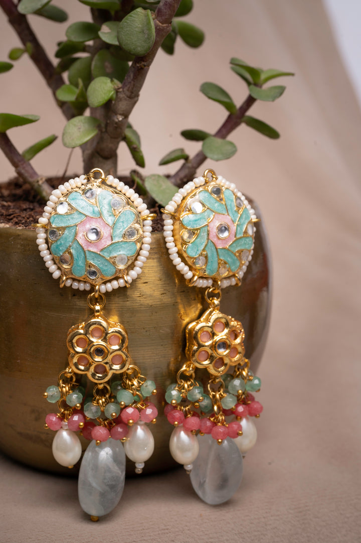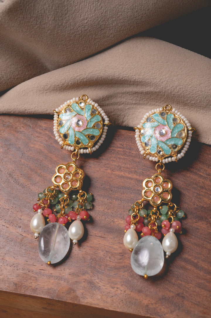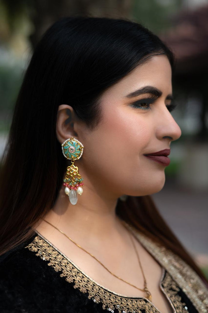 These Shrisha fusion earrings feature high quality stones and Meerut Kundan work, ensuring a beautiful and luxurious accessory. Elevate any outfit with a touch of elan.
