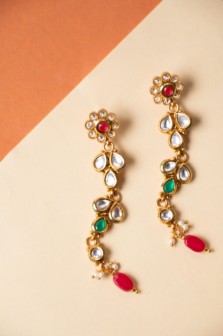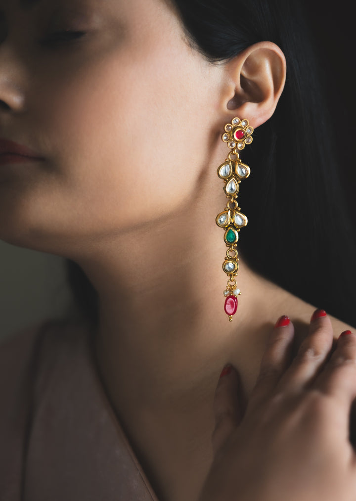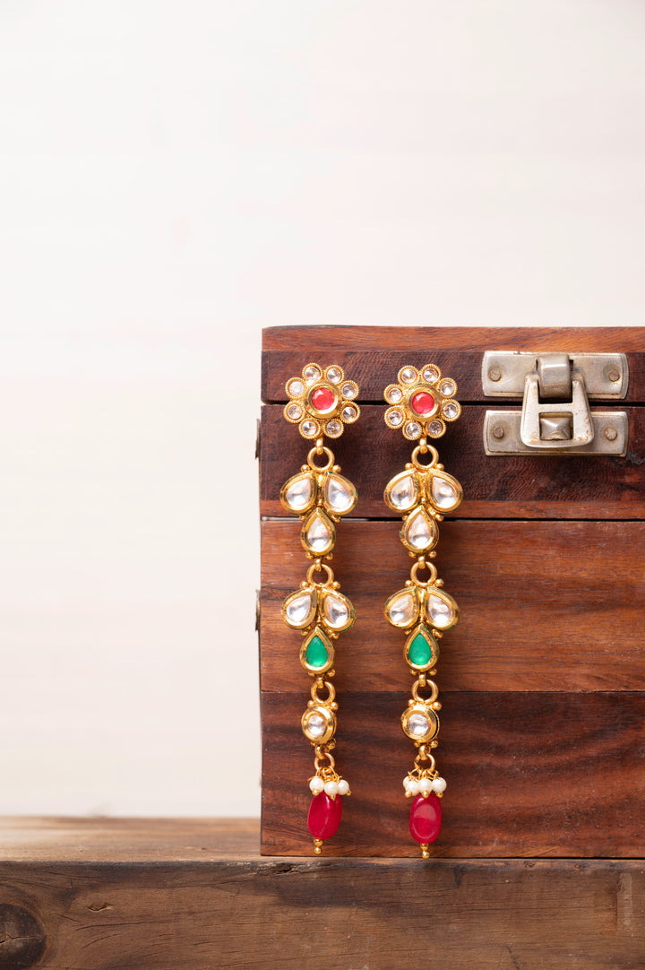 Expertly crafted with high quality kundan, this Punya dangler earrings feature a lustrous gold plating and natural gemstones for added elegance. Enhance any look with these exquisite and timeless accessories.