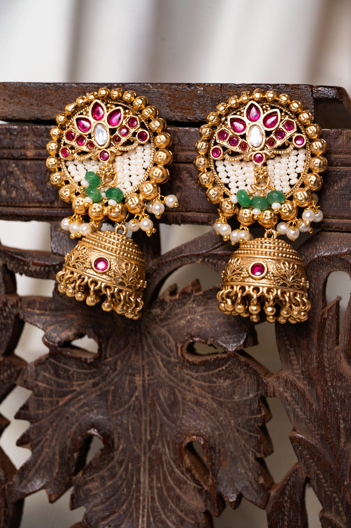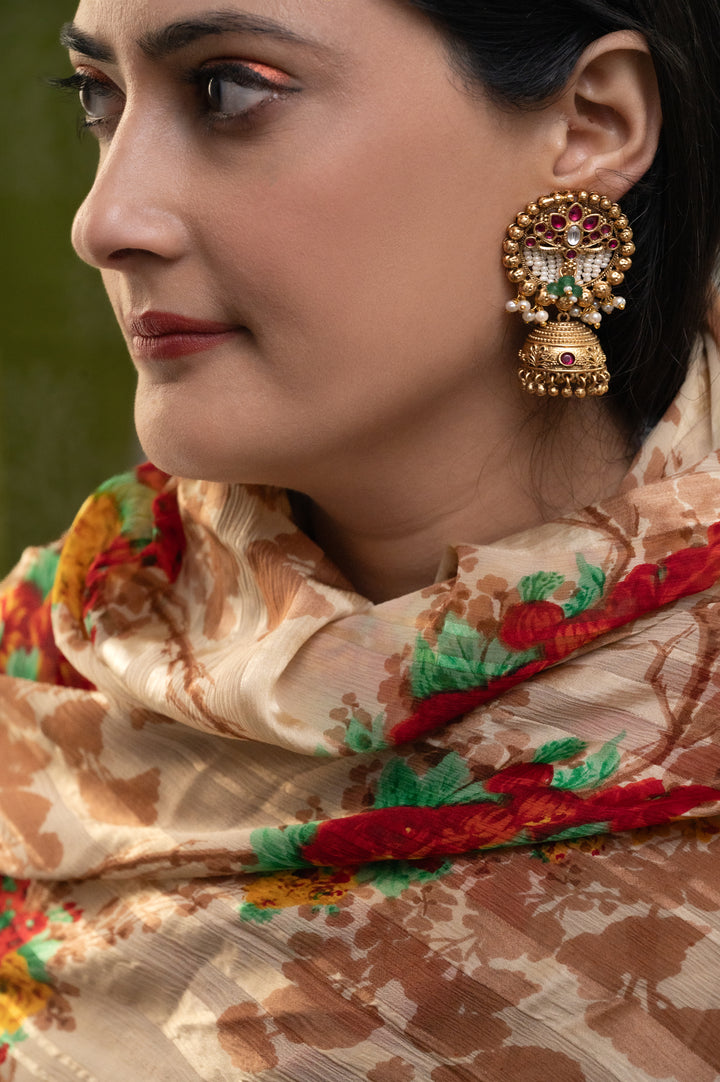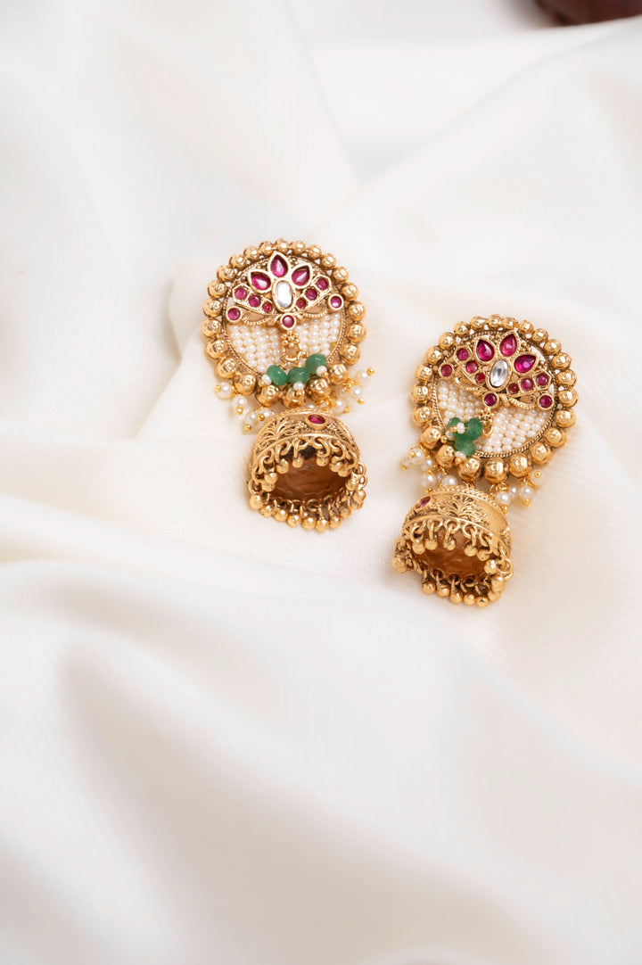 "Indulge in opulence with Thamarai, our exquisite gold jhumkas adorned with delicate flower motifs. Elevate any outfit with these beautifully crafted earrings that exude elegance and sophistication. A must-have for any discerning jewelry collection. Treat yourself to Thamarai today."