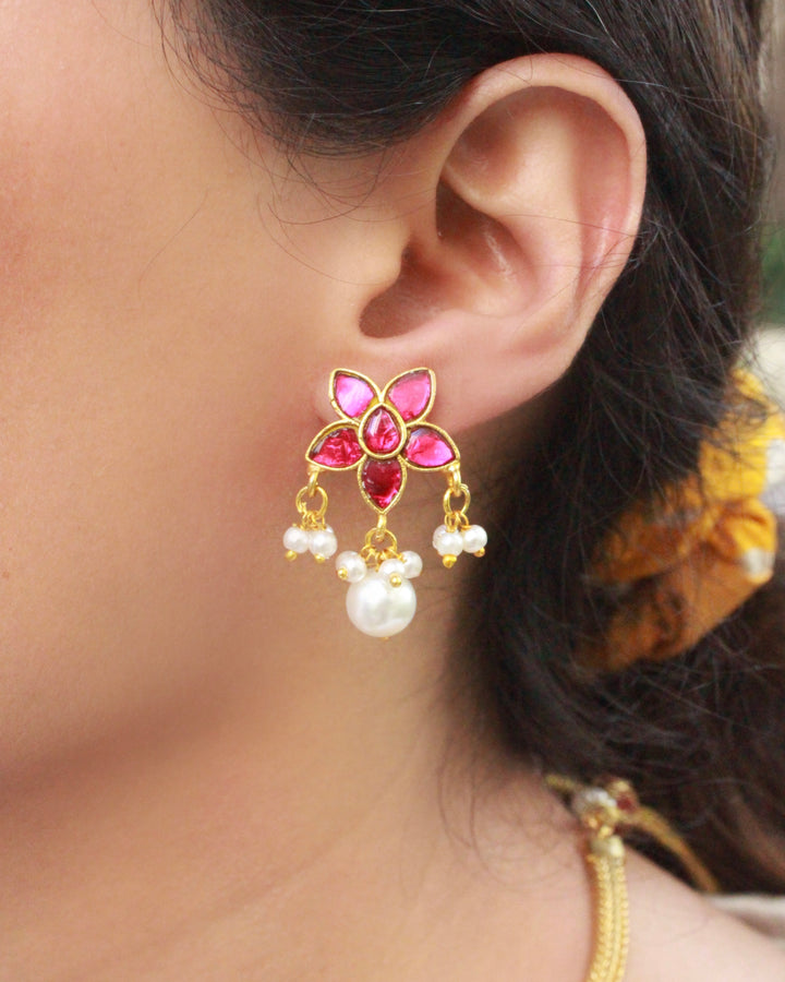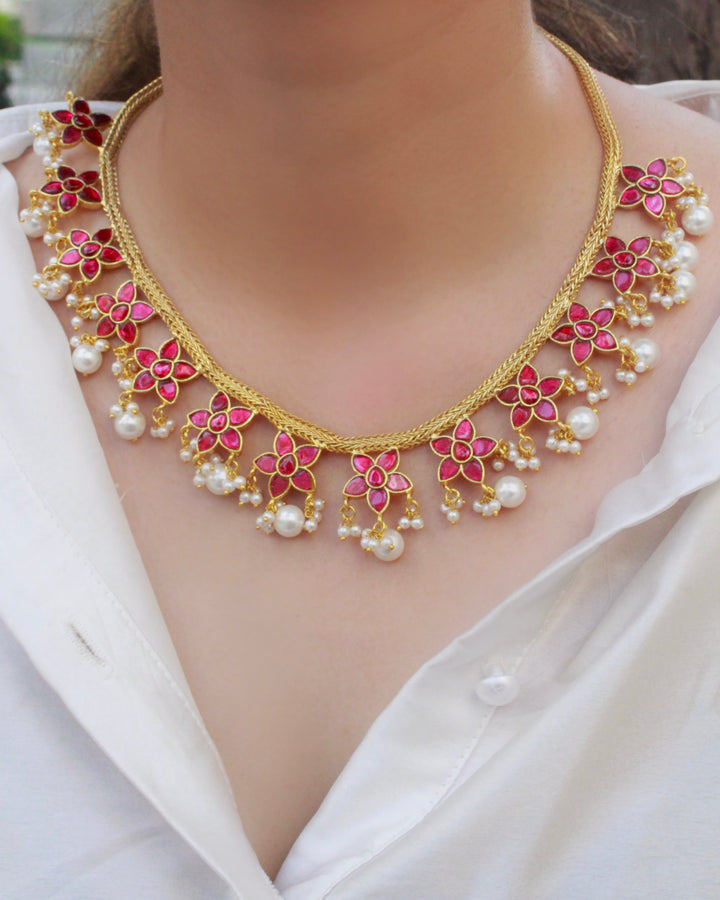 The Anusuya necklace showcases exquisite craftsmanship with delicate pachi kundan work enhanced by lustrous pearls. This elegant piece balances traditional artistry and refined elegance, making it a perfect choice for special occasions or adding a touch of sophistication to any outfit. The pearls bring a timeless charm, complementing the intricate kundan detailing for a luxurious yet graceful appeal.