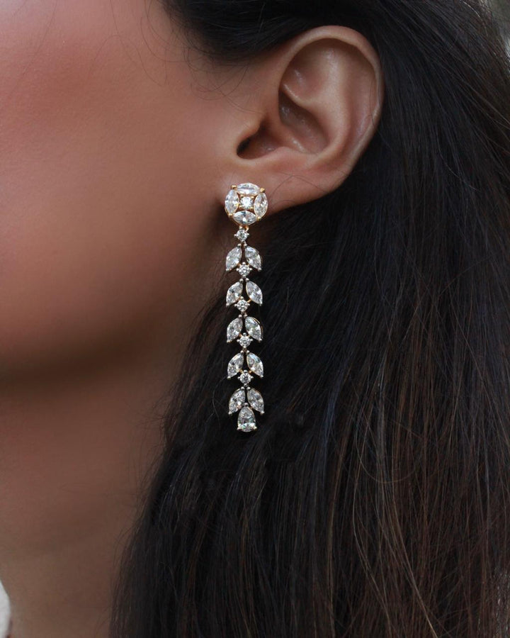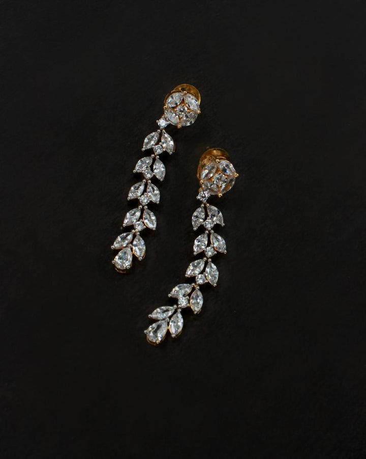 Elevate your elegance with the Das long American diamond earrings, expertly crafted to dazzle from every angle. These earrings feature meticulously set sparkling American diamonds that catch the light beautifully, creating a shimmering effect perfect for evening wear or special occasions. Their elongated design adds a graceful touch, enhancing any outfit with refined sophistication. Lightweight yet striking, these earrings offer a comfortable fit while ensuring you stand out with timeless brilliance.