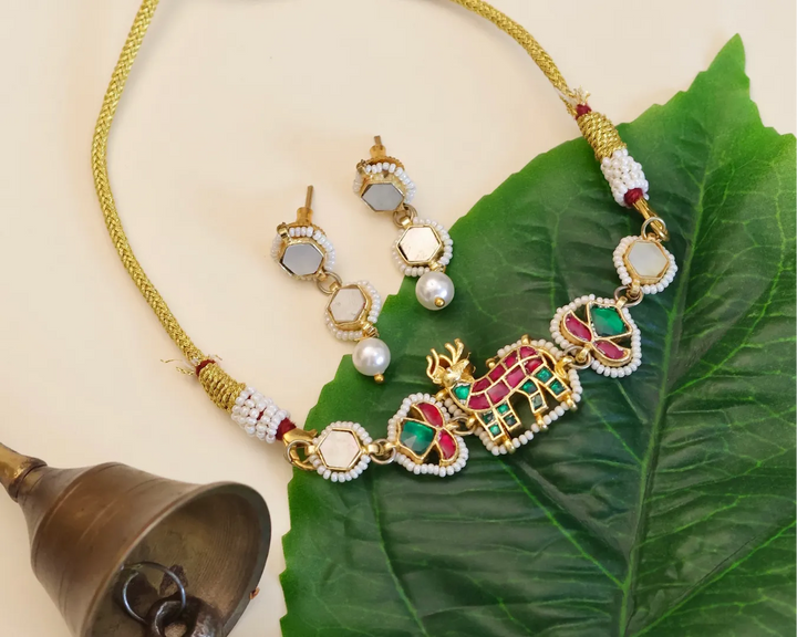 Elevate your style with this exquisite handcrafted Hiran choker set. The delicate pach kundan work and semi precious stones add a touch of elegance and luxury. Perfect for any occasion, this intricately designed set is sure to impress.