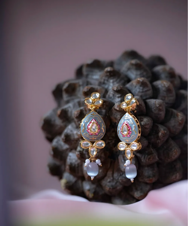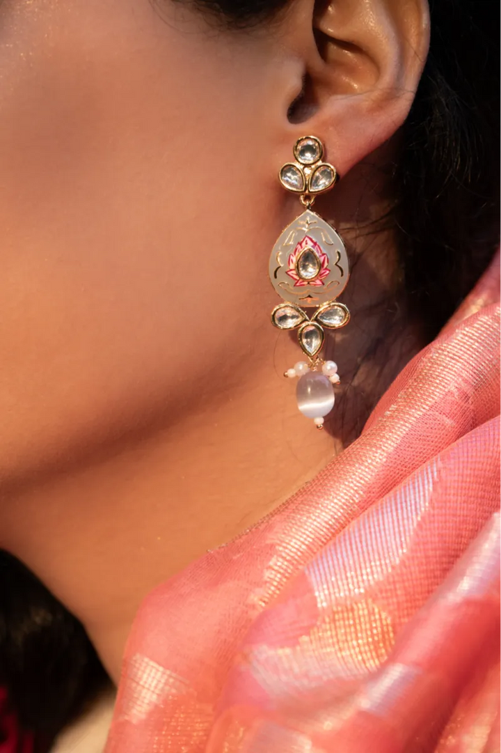 "Add a touch of elegance and charm to any outfit with our stunning earrings. Made with polki and gold plating, these earrings boast a unique and eye-catching flower motif. Elevate your style game with this must-have accessory."