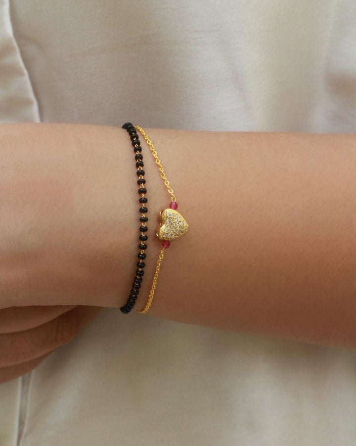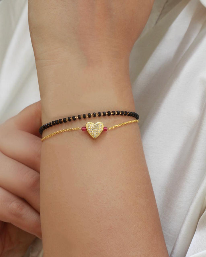 This Eternal Love mangalsutra bracelet features intricate cubic zirconia detailing, combining traditional symbolism with refined craftsmanship. Its delicate design enhances elegance while representing a timeless bond, making it a perfect accessory for meaningful occasions.