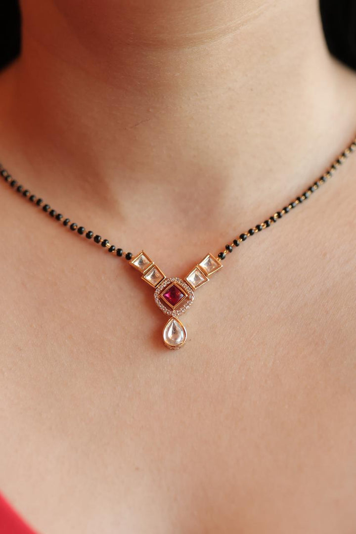 Complete your bridal look with the dainty and elegant mangalsutra set, featuring the timeless beauty of kundan and ruby gemstones. Perfect for the modern bride seeking a touch of luxury and tradition. Elevate your wedding ensemble with this exquisite piece.