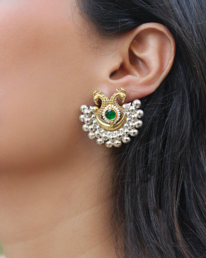 These exquisite silver replica earrings feature a stunning pachi kundan centerpiece, expertly crafted to showcase traditional artistry. The intricate peacock motifs add an elegant touch, symbolizing beauty and grace. Perfect for adding a refined ethnic charm to any attire, these earrings bring together classic design with timeless sophistication.