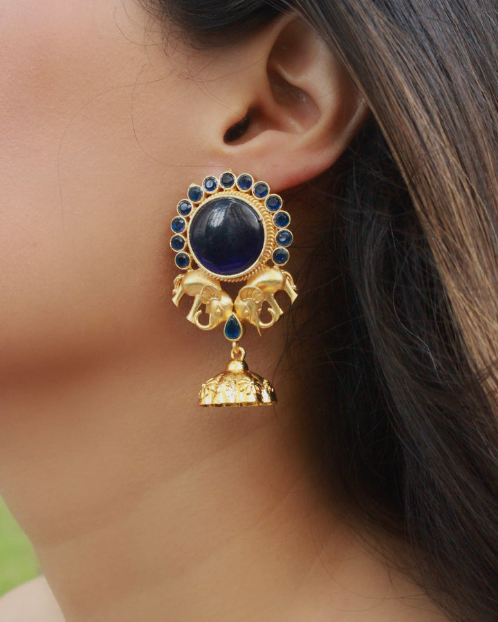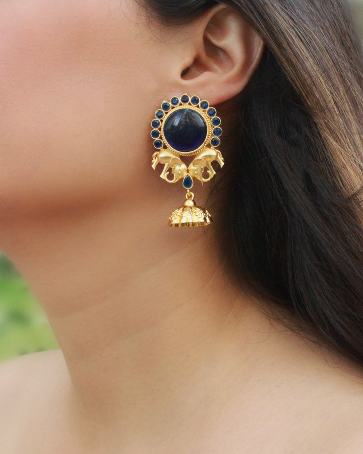 Expertly crafted, these navy blue earrings feature intricate stone embellishments paired with distinctive elephant motifs, symbolizing strength and wisdom. Their rich color and detailed design make them an elegant accessory to elevate your ensemble with cultural depth and refined style.