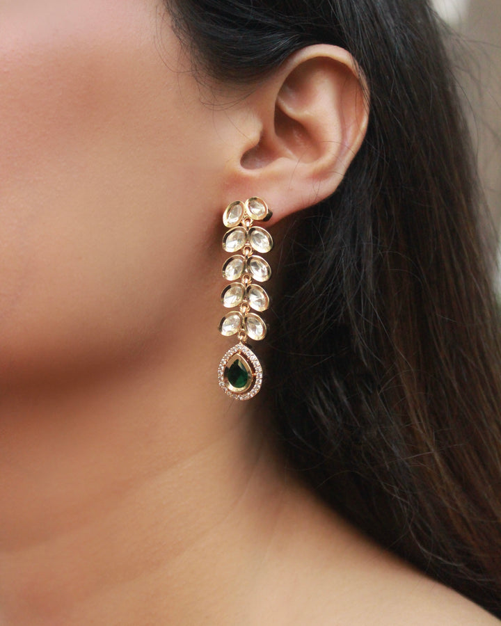 These dark green polki earrings showcase exquisite craftsmanship with traditional uncut stones set to enhance their natural beauty. The rich green hue adds a sophisticated touch, making them ideal for formal occasions or elegant everyday wear.
