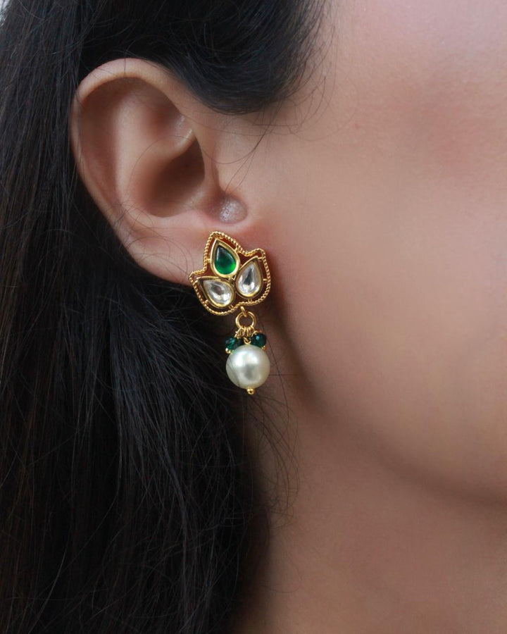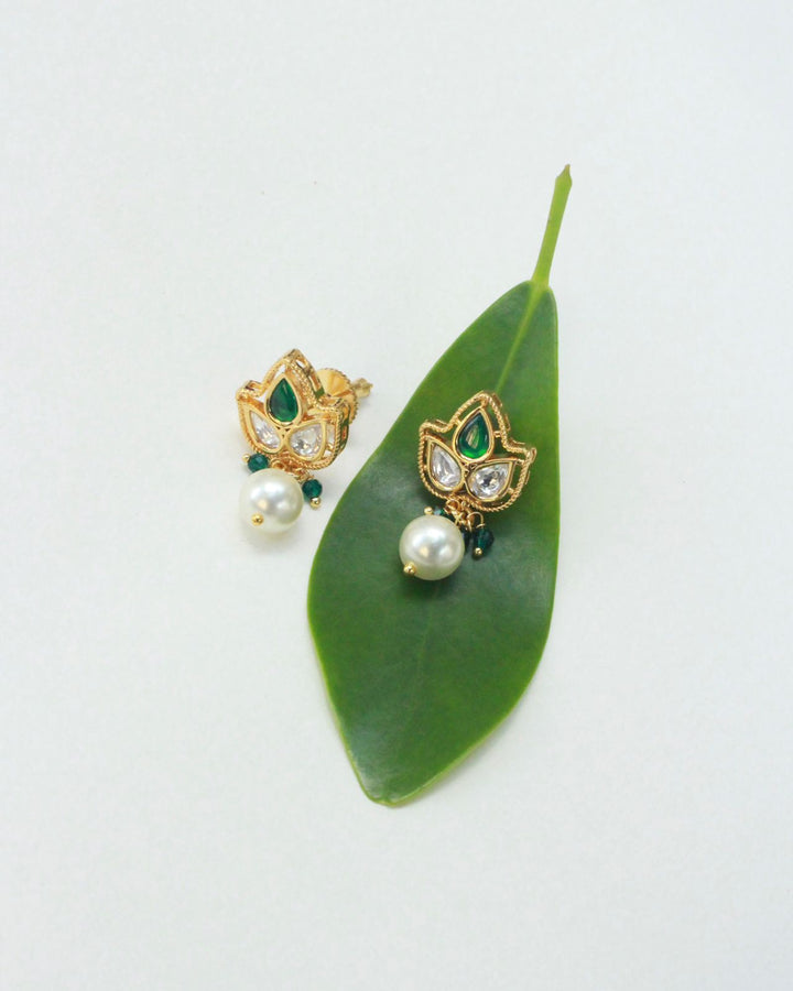 These mini leaf drop earrings blend delicate kundan settings with lustrous pearl drops, offering a refined accessory for elegant occasions. Their lightweight design ensures comfortable wear, while the intricate craftsmanship highlights timeless beauty, making them a sophisticated addition to any jewelry collection.