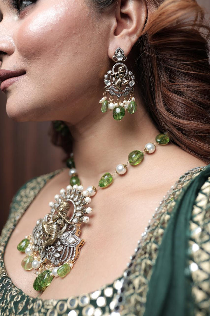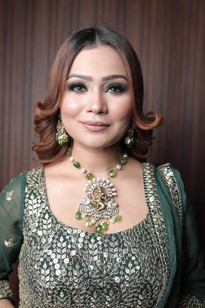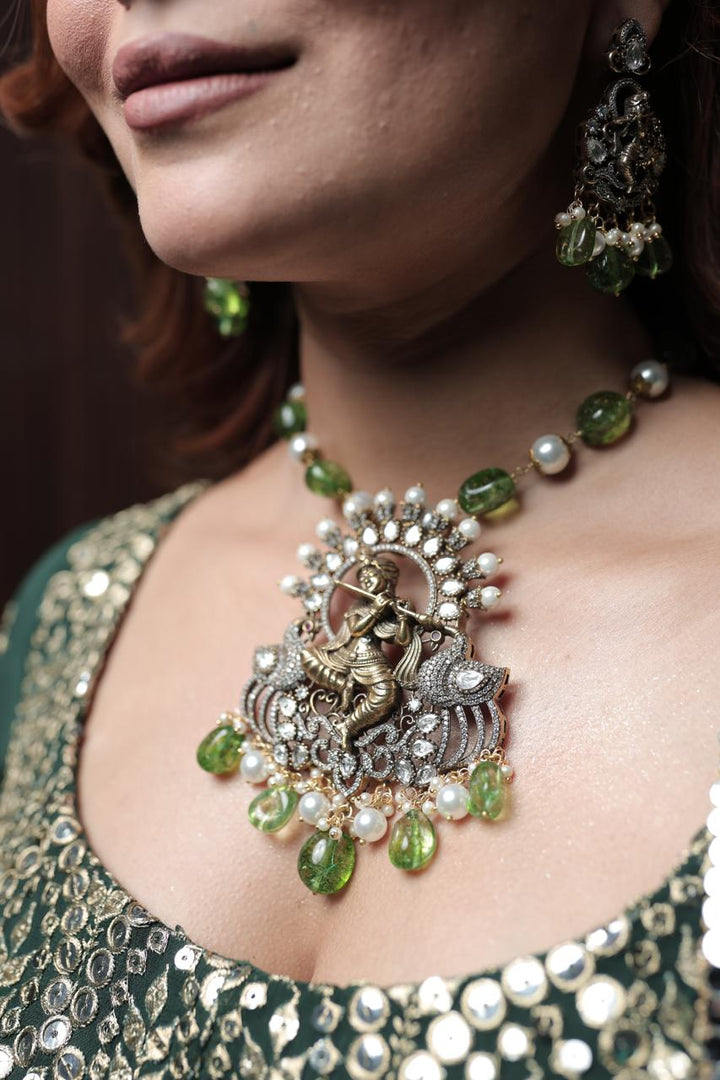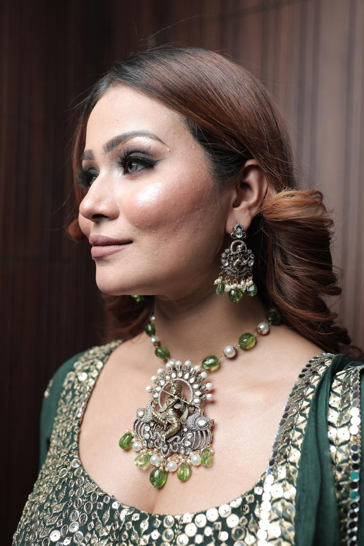 Indulge in the divine energy of Mayura with dazzling green gemstones that represent the inner self dancing to the tunes of Lord Krishna playing a flute. Find your inner joy and channel it through this unique and playful adornment. Embrace your divinity with Mayura.