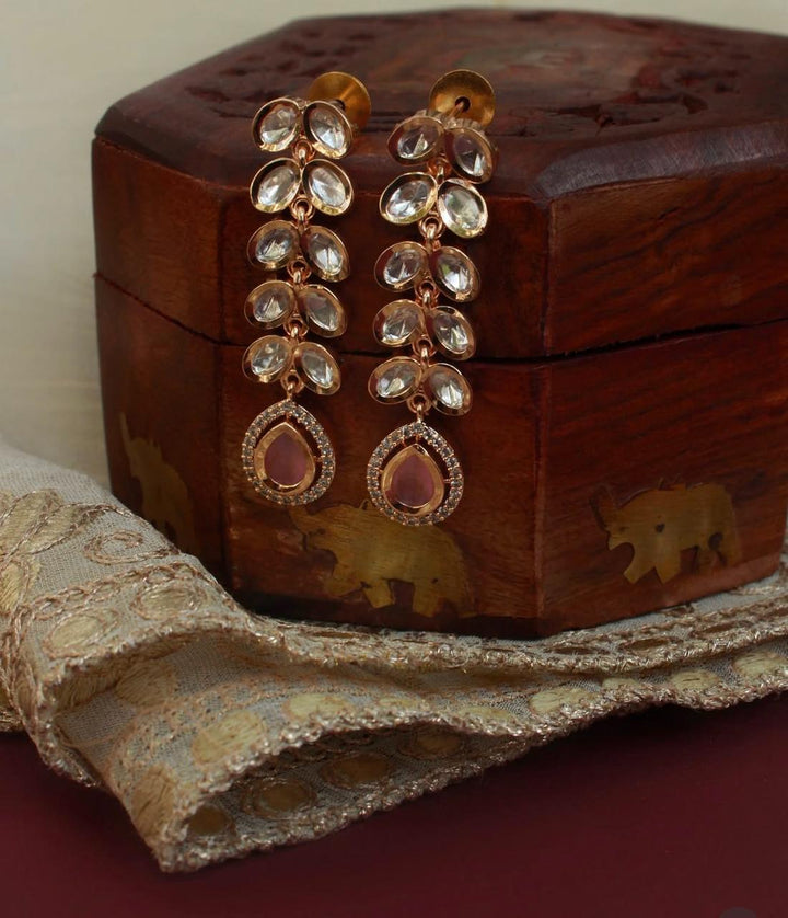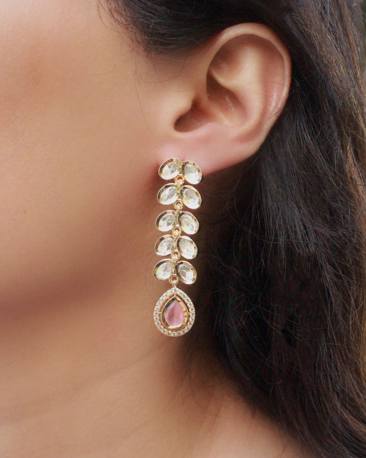 Elevate your style with the Nysa earrings, featuring expertly crafted polki work that highlights a soft pink natural stone. These earrings combine traditional artistry with the gentle charm of the stone, offering a sophisticated accessory that enhances both casual and formal looks.