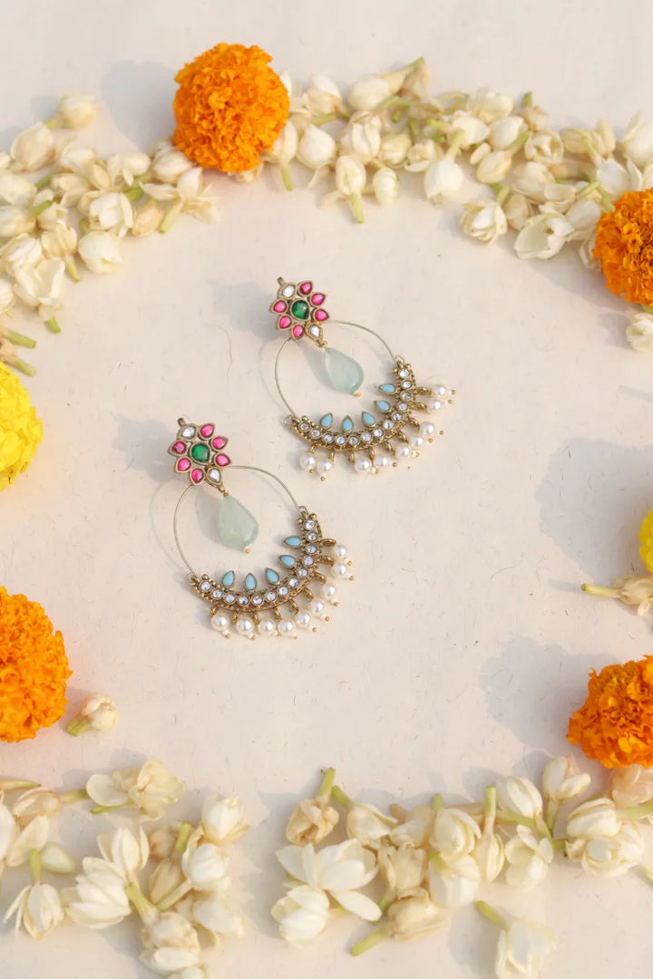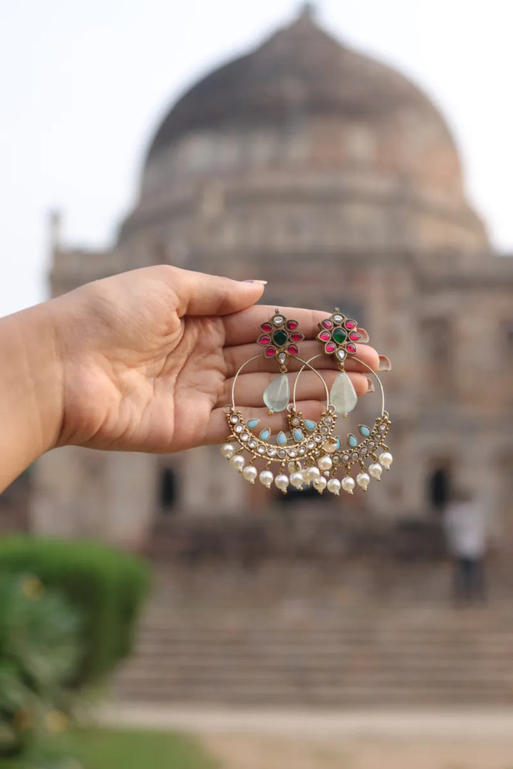 Elevate your look with Samudra, stunning pachi kundan chandbalis. Adorned with light blue semi-precious stones and delicate fresh water pearl drops, these earrings exude elegance and luxury.  Make a statement and shine with Samudra.