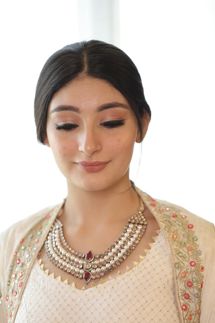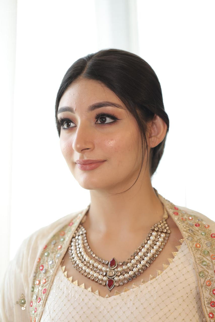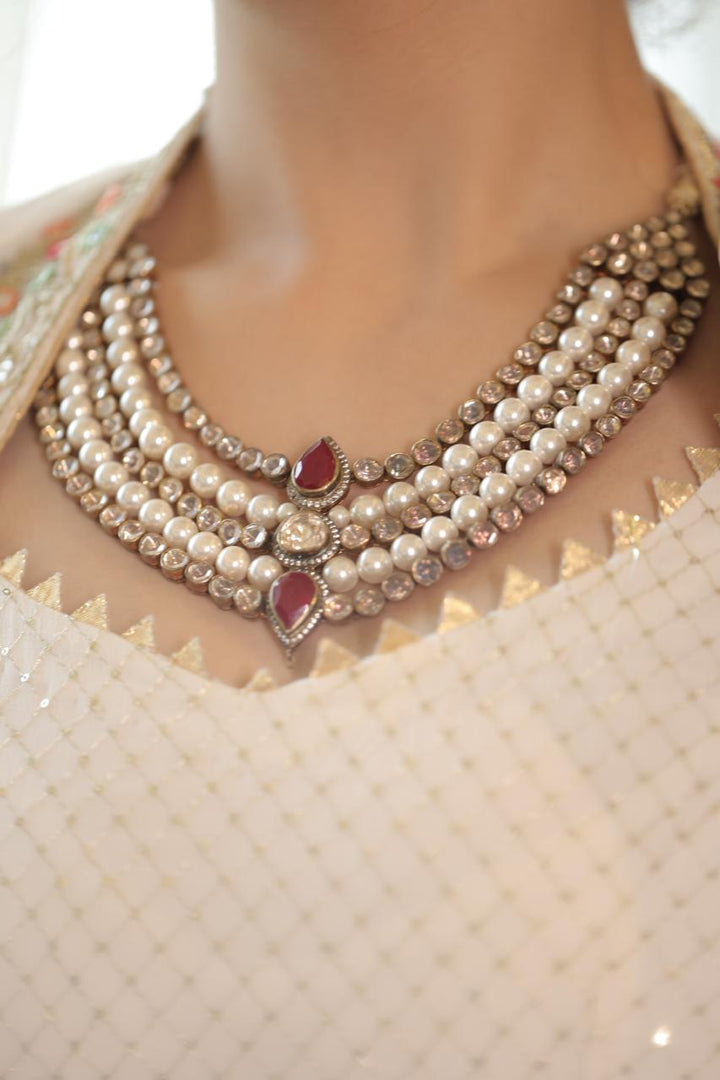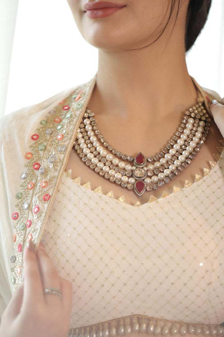 Indulge in timeless elegance with Trinayanam, a kundan choker adorned with lustrous pearls and natural gemstones. This anti-tarnish piece exudes luxury and sophistication, perfect for any occasion.