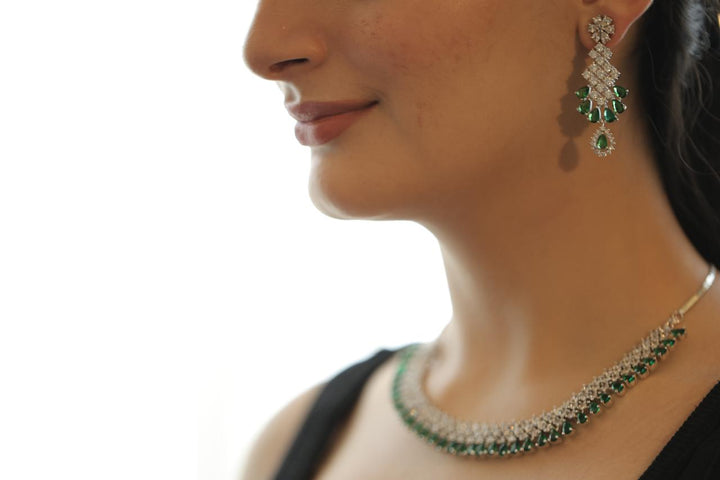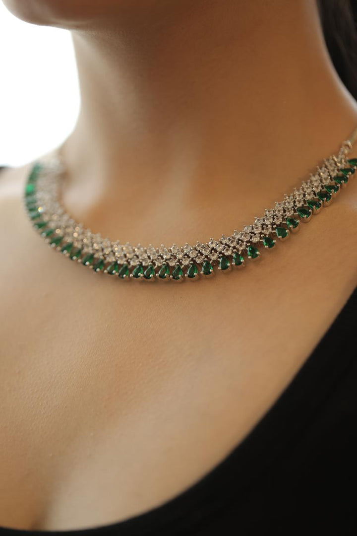 Accentuate your style and aura with Vedya. This delicate necklace features small dainty emeralds set in cubic zirconia for a luxurious look. Perfect for any occasion, it adds a touch of elegance to your outfit. Treat yourself or someone special to this timeless piece.